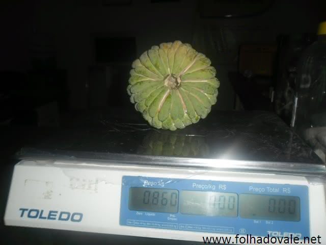 O fruto “gigante” chega a pesar 860 gramas. A fruta foi colhida no quintal do malhadense Auildes Bastos, que garantiu que o pé de pinha não recebeu nenhum adubo.