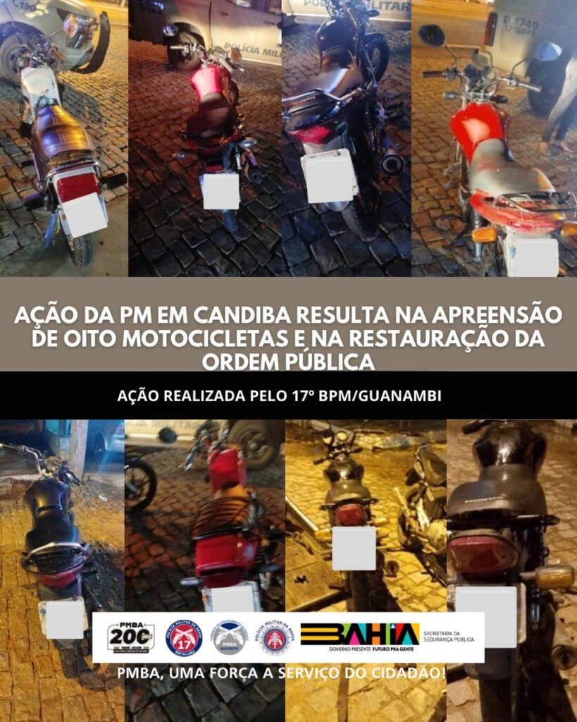 CANDIBA — Uma operação deflagrada pela Polícia Militar (PM) resultou na apreensão de 8 motos na noite de sexta-feira (7), em Candiba, na região sudoeste da Bahia. Os policiais realizaram uma ampla operação de fiscalização no distrito de Pilões, após denúncias de desordem e direção perigosa praticada por um grupo de cerca de 50 motociclistas.