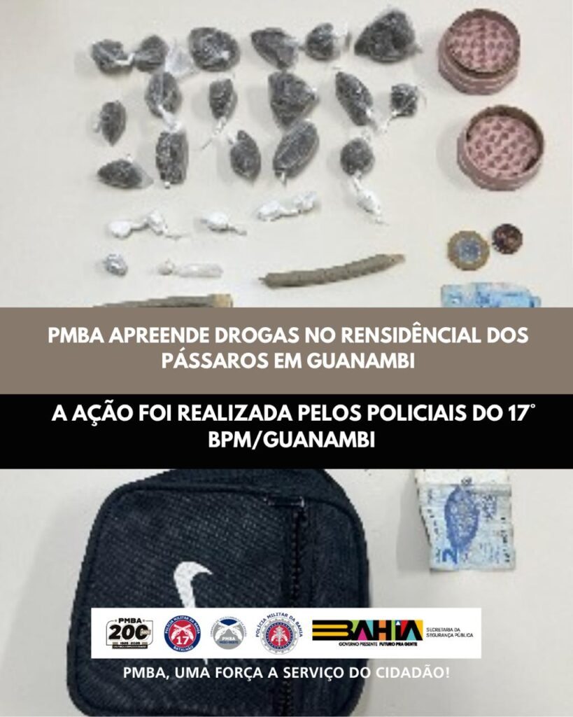 GUANAMBI — Policiais do 17º BPM de Guanambi, na região sudoeste da Bahia, apreenderam entorpecentes na manhã de segunda-feira (17), durante patrulhamento no bairro Residencial dos Pássaros. A PM recebeu informação de que um homem estaria comercializando drogas em via pública, então foi averiguar.