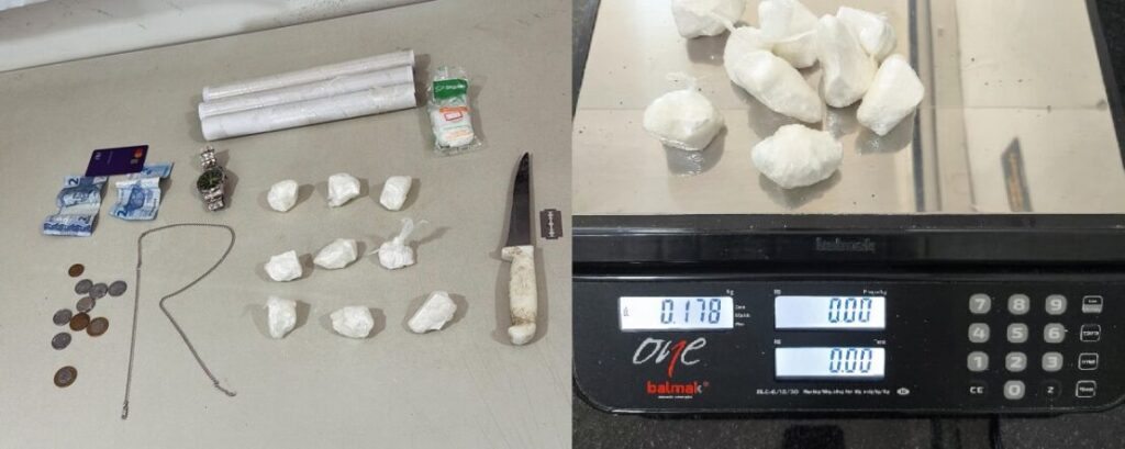 Na abordagem e na busca, os policiais encontraram diversos materiais ilícitos, o que caracteriza, segundo a PM, a prática de tráfico.