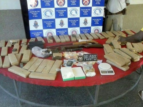 Os policiais flagraram a irmã de Jaelson, identificada por Adriana Pereira dos Santos, 21 anos, e apreenderam no endereço, duas malas de viagem com três quilos e 173 gramas de cocaína, 500 gramas de crack, 44 quilos de maconha, uma espingarda calibre 12, um rifle 22, uma pistola, R$ 834 reais em espécie, faca de corte, duas balanças de precisão e sacolas plásticas para armazenamento e comércio da droga.