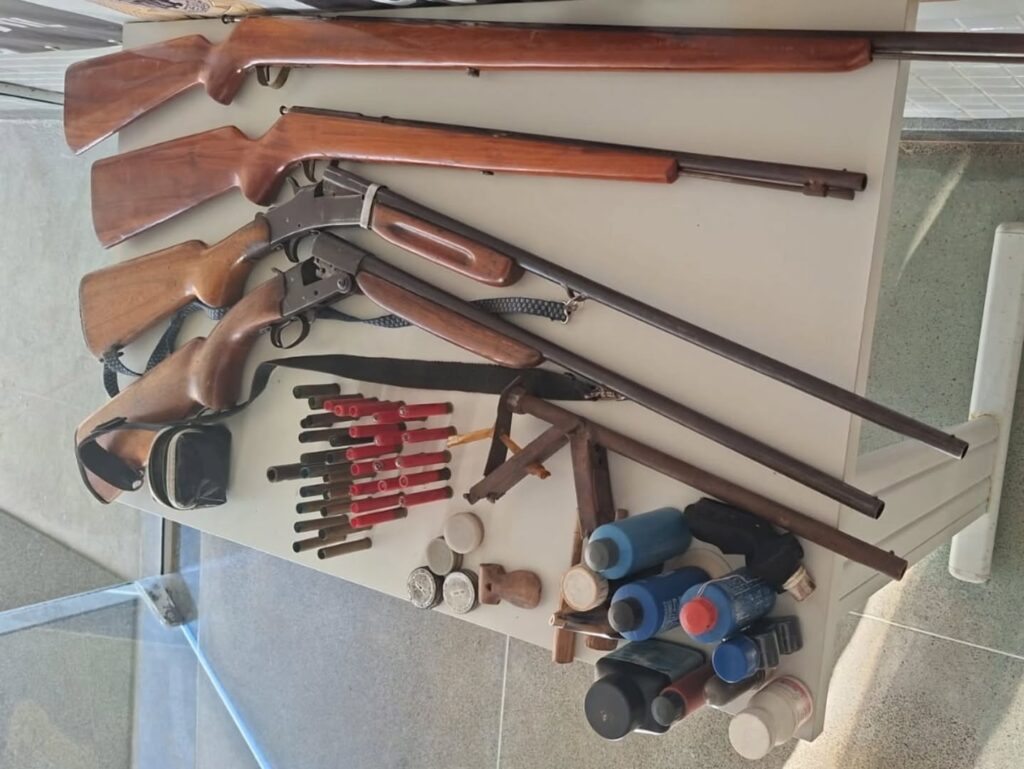 Entre os materiais apreendidos estão quatro espingardas, sendo duas de fabricação artesanal e duas cartucheiras de calibres .32 e .36, além de munições intactas e outras deflagradas. Também foram encontrados recipientes contendo pólvora e chumbo, espoletas e instrumentos utilizados para atrair animais silvestres.