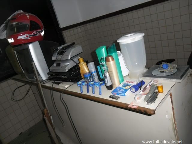 A polícia recuperou dois aparelhos de DVD, dois receptores de antena, shampoo, barbeadores, uma espingarda tipo chumbeira, um botijão de gás e diversos outros produtos.