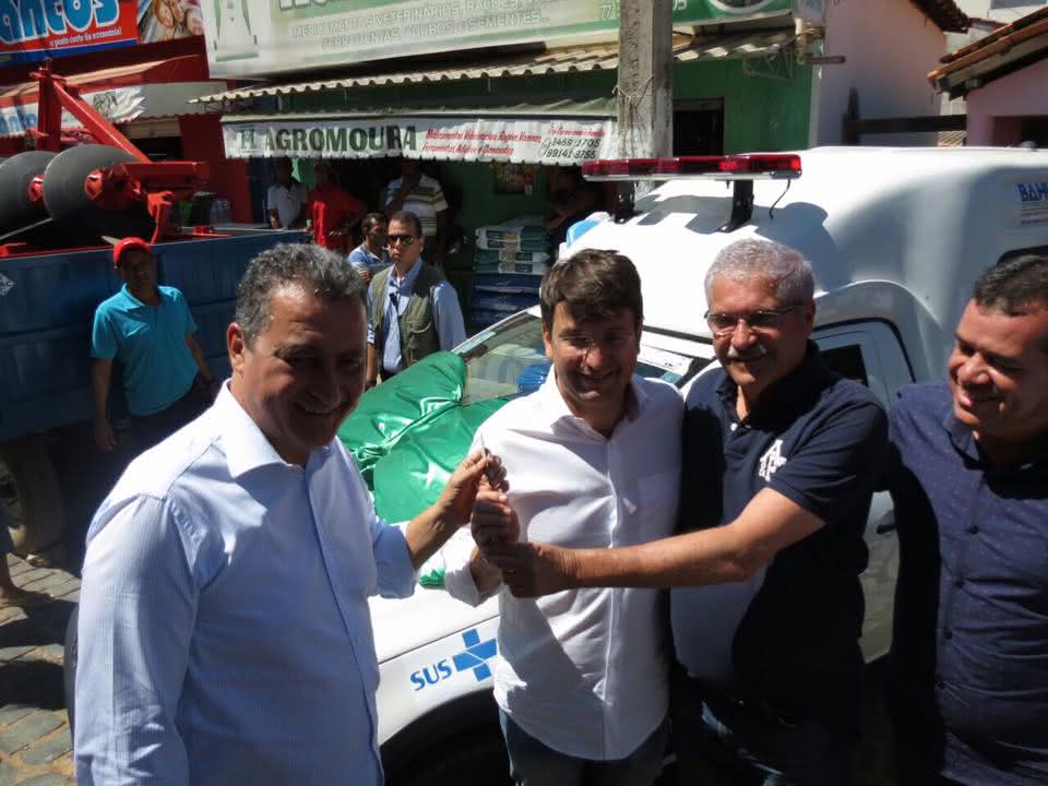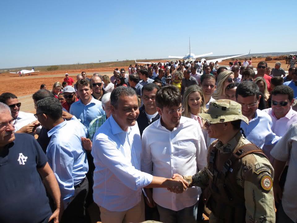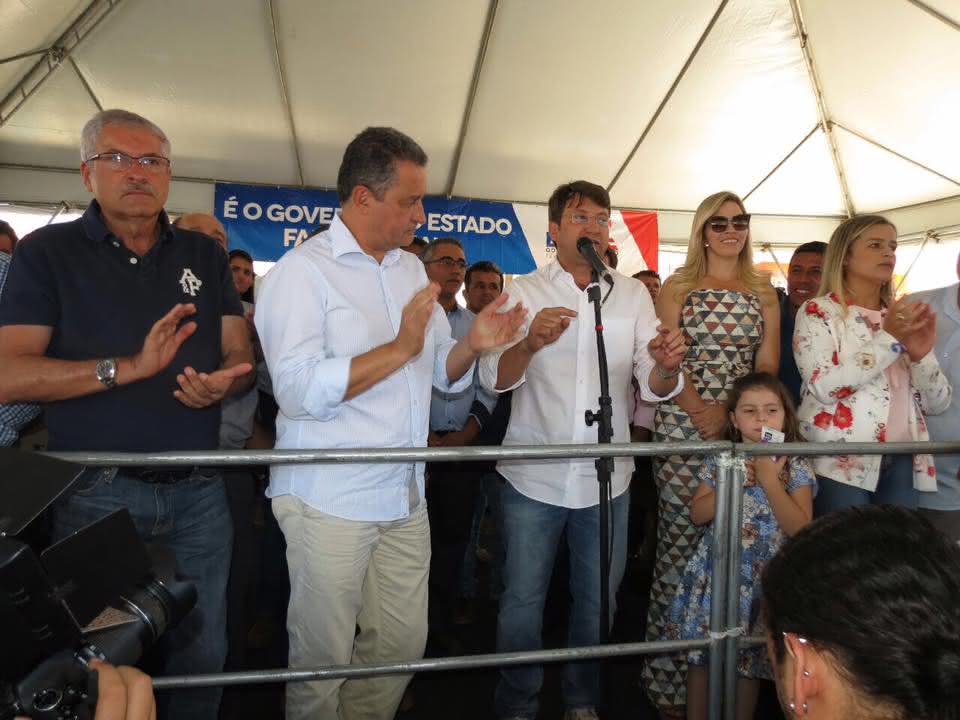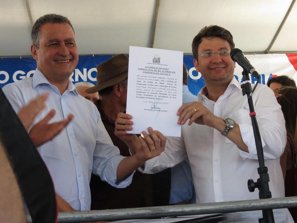 Ao lado do governador Rui Costa (PT), secretários de Educação, Walter Pinheiro e Desenvolvimento Econômico, Jaques Wagner, deputados José Rocha (PR) e Marcelo Nilo (PSL), o inaugurou o Aeroporto, Detran,Sine-Bahia e Ponto do Cidadão. Além disso, foi entregue uma ambulância 0 km em pareceria com o Estado e ambulância adquirida com recursos próprios, três tratores, duas caminhonetes L 200 para Guarda Municipal e Assistência Social, encascalhamento de Cocos ao povoado de Pé de Serra.Rui aproveitou o momento para assinar autorização de implantação do Curso Técnico Profissional em Agronegócios, e também anunciou a reforma da Escola Estadual de Cocos, com construção de quadra coberta e anexo destinado ao novo curso. “Me comprometo com a reforma do mercado municipal. Levem-me o projeto que vamos ver com a Conder [Companhia de Desenvolvimento do Estado da Bahia] como realizar a obra. Da mesma forma o estádio. Vamos acionar a Sudesb -Superintendência dos Desportos do Estado, para buscar os recursos para a construção da arquibancada”, completou o governador.
