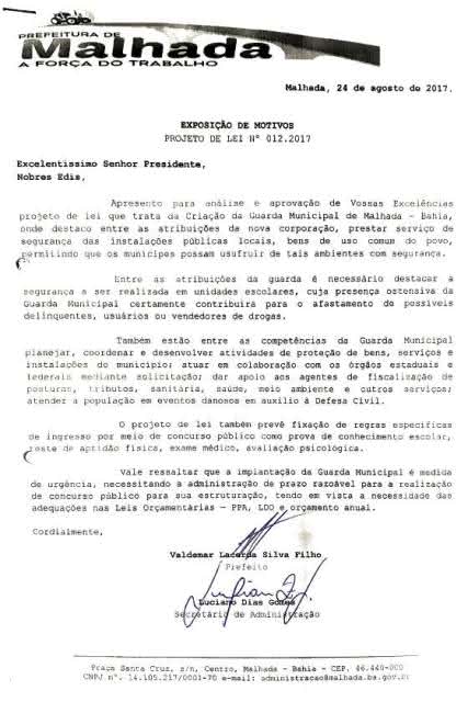 A Prefeitura de Malhada encaminhou à Câmara Municipal, através da Secretaria de Administração, o projeto de Lei n° 012/2017 que trata da criação da Guarda Municipal. A instituição terá a função de zelar pelos bens, equipamentos e prédios públicos do município, exercer a vigilância diuturna interna e externa no patrimônio público – escolas, centros municipais de educação infantil e outros.