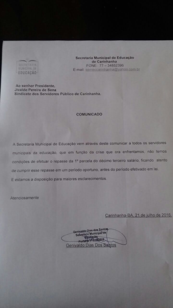 O Secretário de Educação do município de Carinhanha, no oeste da Bahia, Genivaldo Das dos Santos, em ofício direcionado aos servidores públicos na última quinta-feira, 21 de julho, informando que diante da crise que o município vem atravessando não tem como efetuar a primeira parcela do décimo terceiro aos servidores.