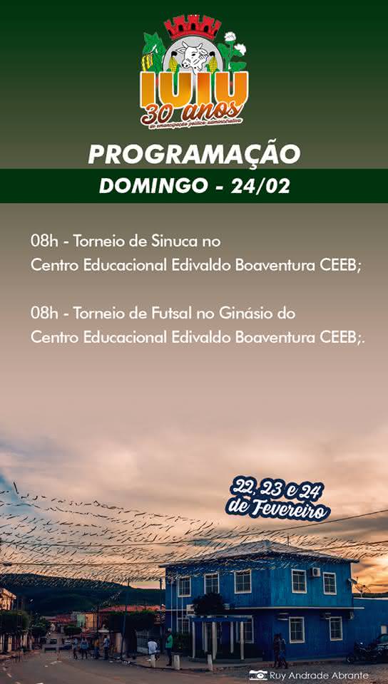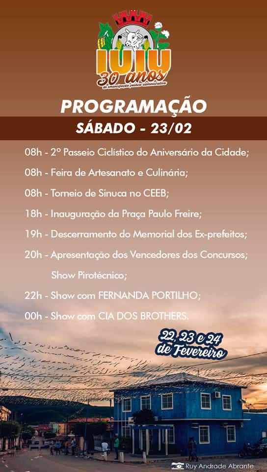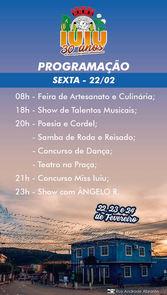 A prefeitura de Iuiú, no sudoeste da Bahia, abriu a festa de comemoração pelos 30 anos de emancipação política da cidade. O evento começa nesta sexta-feira (22), conforme informação do Departamento de Cultura.
