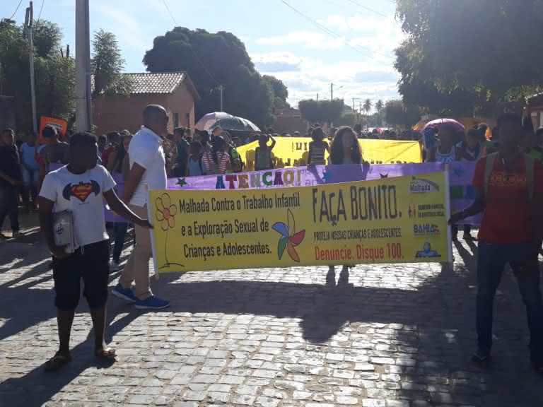 Crianças, adolescentes, professores e pais de alunos, percorrem algumas várias ruas da cidade de Malhada, na última terça-feira, 12 de junho, no Dia Mundial em Combate ao Trabalho Infantil. O evento foi realizado pela Prefeitura de Malhada, através das secretarias de Assistência Social, Educação e Saúde, com apoio do Conselho dos Direitos da Criança e Adolescente e Conselho Tutelar.