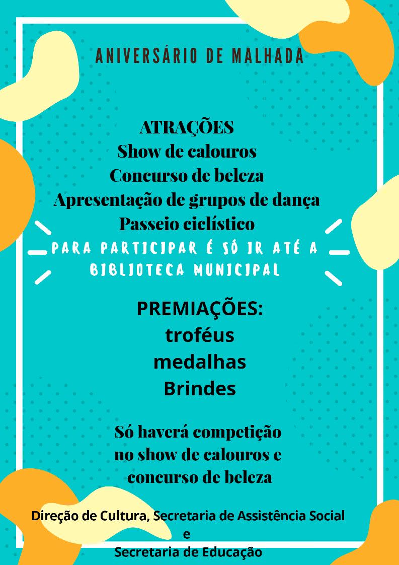 A Prefeitura Municipal de Malhada, através da secretaria de Educação, Cultura e Esporte, divulgou a programação do aniversario de 55 anos de emancipação política. O eventos terão início na sexta-feira, 6 de abril, com apresentação do Zumba na Praça de Santa Cruz, às 17h00, apresentação e apresentação de grupos de dança às 20h00.