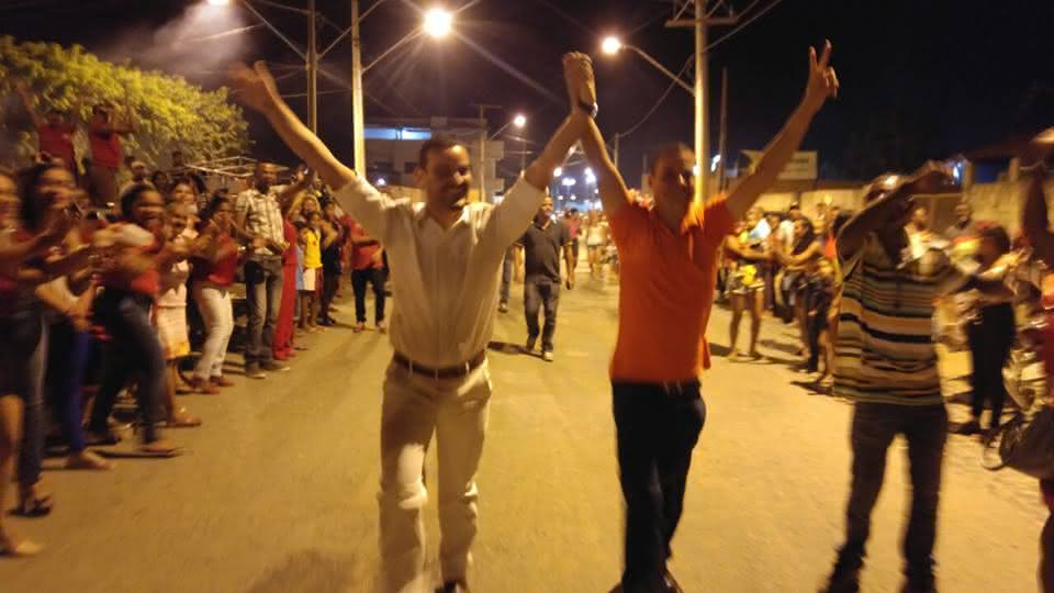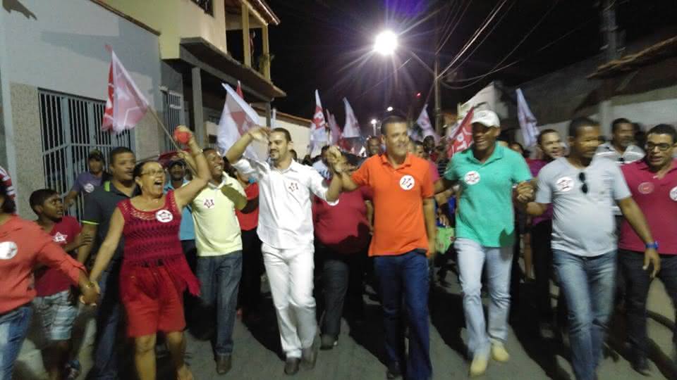 Com bandeiras, camisas vermelhas ,a estrela do partido colada no peito, o gestor e seu vice seguiram de mãos dadas nas ruas de