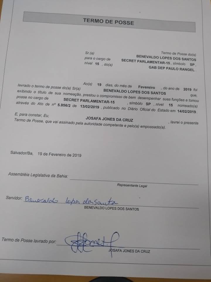 O radialista e suplente de vereador Benevaldo Lopes dos Santos (Super Bené), de 36 anos, foi nomeado como secretário Parlamentar do deputado Paulo Rangel (PT), através do Ato N- 5.856\2 de 13 de Fevereiro de 2019, foi publicada no Diário Oficial do estado da Bahia no último dia 14 de Fevereiro.