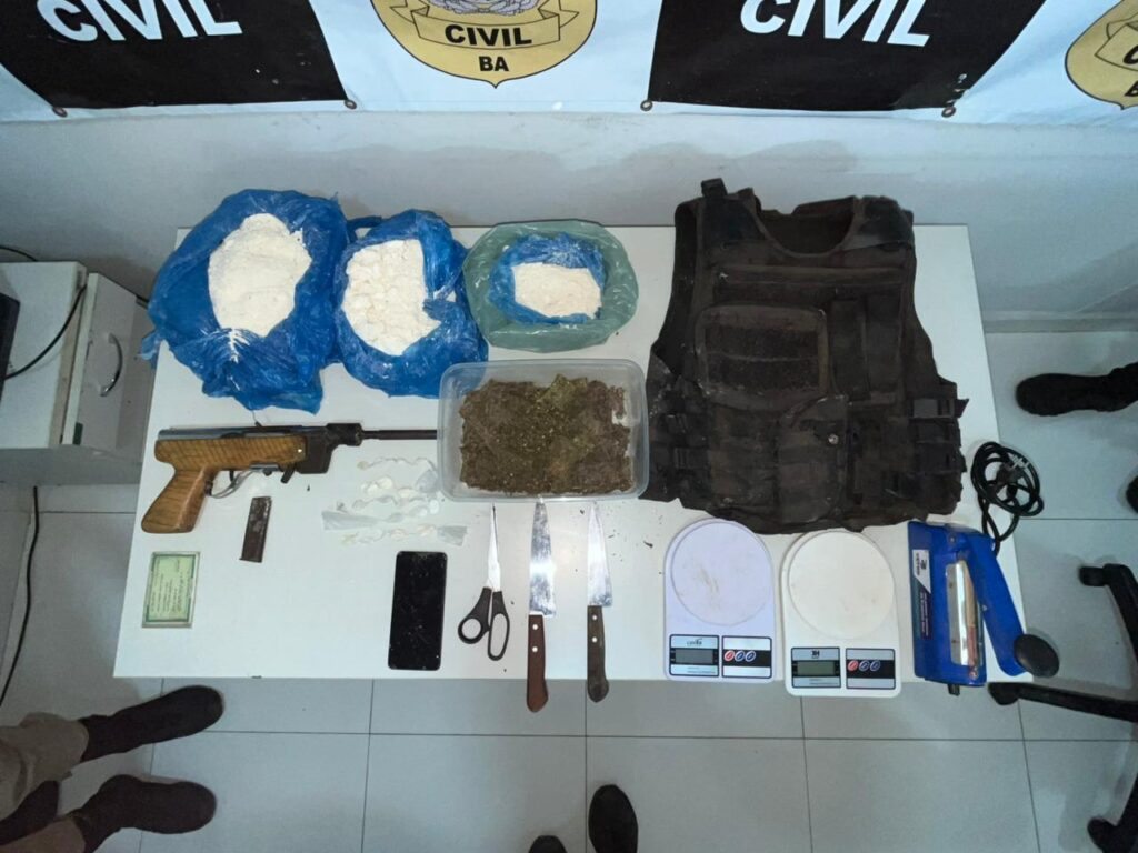Durante a varredura no local, foram encontrados entorpecentes, materiais utilizados para preparo e fracionamento de drogas, além de uma arma de fogo artesanal e uma capa de colete balístico.