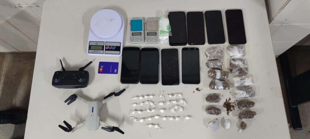 No interior da residência, os militares visualizaram, sobre um móvel do tipo rack e ao alcance imediato das crianças, diversas porções de substância análoga à maconha, além de aparelhos celulares sem procedência declarada.
