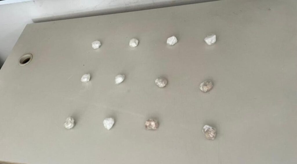 A guarnição realizou o acompanhamento e conseguiu localizar o suspeito. Durante a abordagem, foram encontrados cinco invólucros de substância análoga ao crack, pesando aproximadamente 52 gramas, e sete invólucros de substância análoga à cocaína, com peso aproximado de 74 gramas.