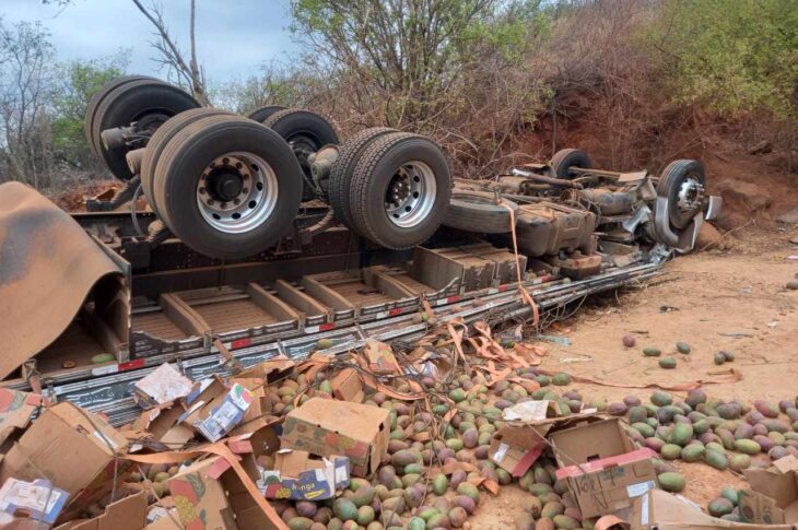 Caminhão carregado com mangas capota na BR-030, entre Caetité e Guanambi