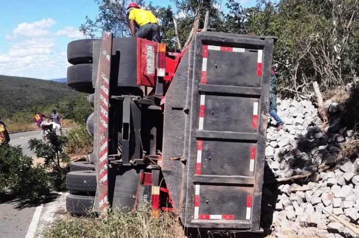 Caminhão caçamba tomba na BA-611 entre Brejinho das Ametistas e Caetité
