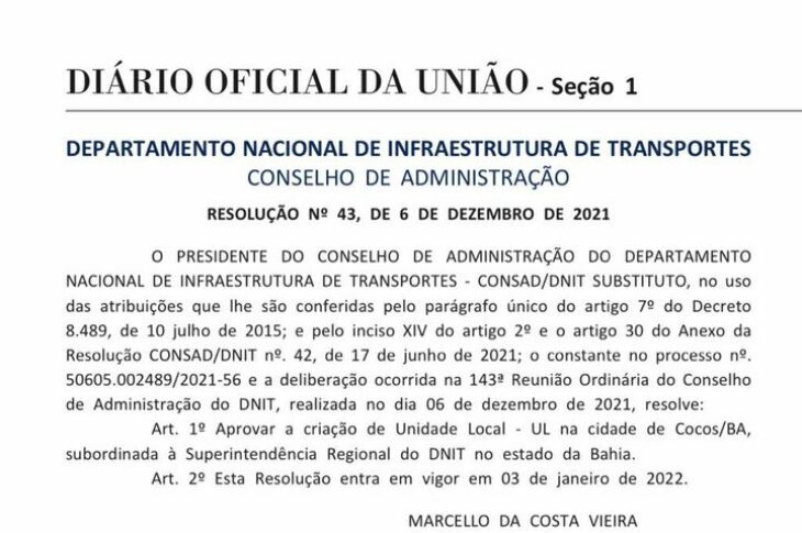 Cocos receberá unidade local do DNIT em 2022