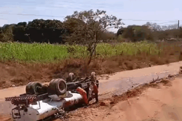 Caminhão-pipa tomba na BR-030 em Feira da Mata