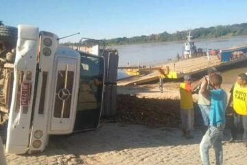 Caminhão carregado de mandioca tomba no Porto das Balsas em Manga