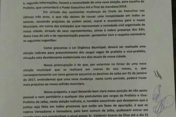 Em protocolo encaminhado ao Ministério Público e Câmara de Jaíba sociedade civil e organizada pede permanência de Valdemir Soares no cargo de prefeito