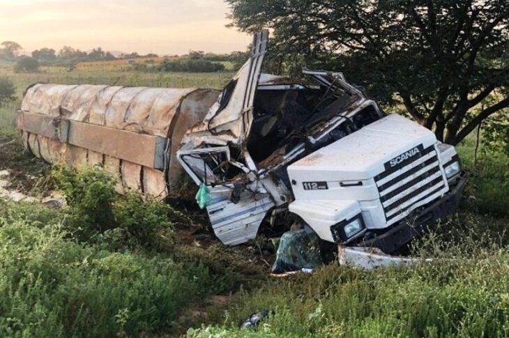 Caminhão-tanque carregado com combustíveis capota na BA-152 em Paramirim