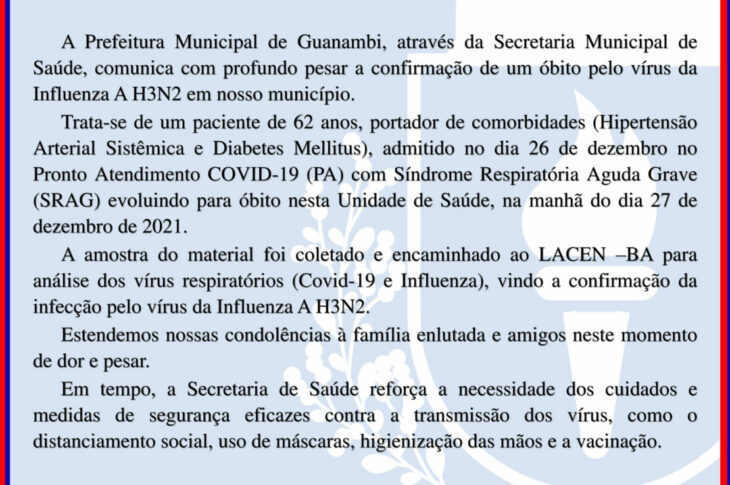 Guanambi registra o primeiro óbito por Influenza A H3N2