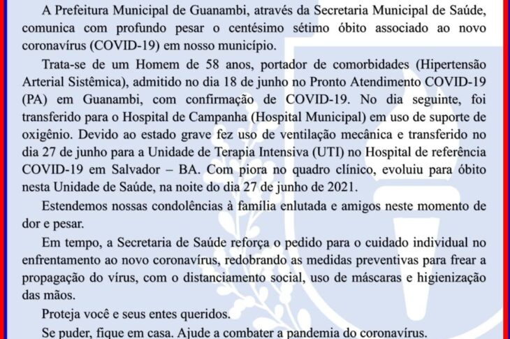 Guanambi registra centésimo sétimo óbito por complicações da Covid-19