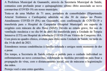 Quinquagésimo quinto óbito por complicações da Covid-19 é registrado em Guanambi