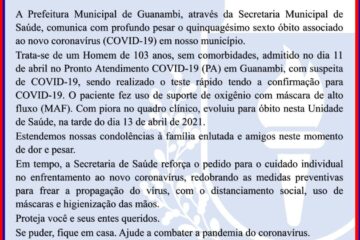 Guanambi registra quinquagésimo sexto óbito por Covid-19 é 74 casos