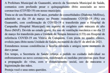 Guanambi confirma quinquagésimo óbito e mais 50 casos de Covid-19
