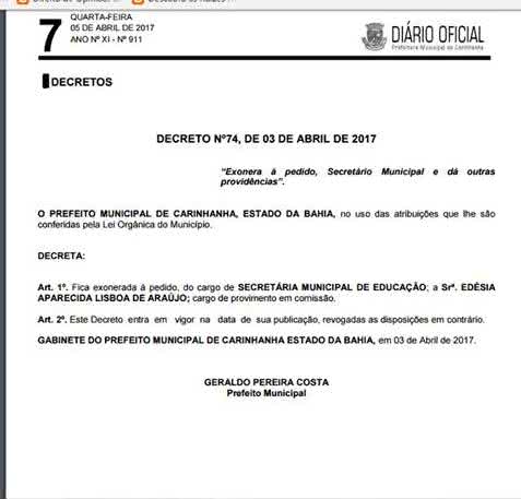 A Secretária de Educação de Carinhanha, no Oeste da Bahia, Edésia Aparecida Lisboa Araújo, foi exonerada do cargo na última quarta-feira, 5 de abril. A exoneração foi oficializada na edição do Diário Oficial publicada na última quarta, no Decreto de nº 74 de 3 de abril.