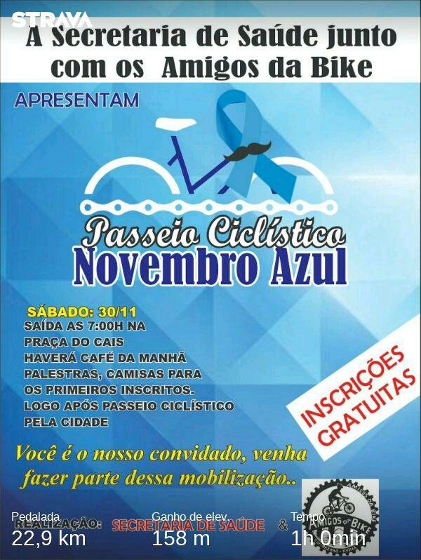 A secretaria de Saúde e o Grupo Amigos da Bike realizam o Passeio Ciclístico, denominado de “Novembro Azul”, neste sábado (30), em Carinhanha. O evento tem o objetivo de reforçar a importância da prevenção e do diagnóstico precoce do câncer de próstata, conforme os organizadores.