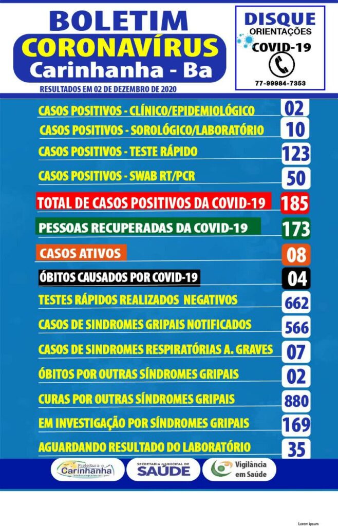 Ao todo, Carinhanha registra 185 casos confirmados, 173 recuperados, contudo, 8 casos ATIVOS. Quatro pessoas já morreram em decorrência da coronavírus.