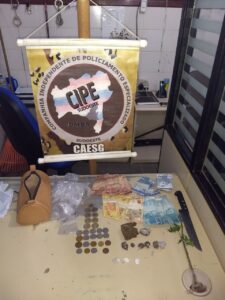 Durante buscas na casa do suspeito, foi localizado mais drogas semelhante à maconha e cocaína, outra quantia em dinheiro totalizando R$ 550,10 ( quinhentos e cinquenta reais e dez centavos), além de várias embalagens plásticas usadas para guardar a droga, uma faca tipo peixeira utilizada para cortar drogas.