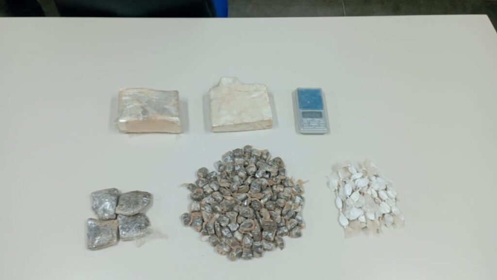 Foram 112 trouxinhas de maconha, quatro pedaços maiores da mesma substância, dois tabletes de cocaína pesando aproximadamente 900 gramas e 70 papelotes prontos para a comercialização, além de uma balança de precisão portátil. Também foi apreendido um aparelho celular que estaria sendo utilizado na atividade criminosa.
