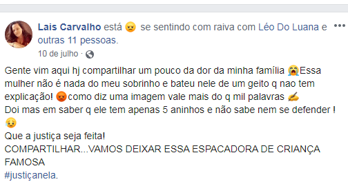“Gente vim aqui hj compartilhar um pouco da dor da minha família 😭Essa mulher não é nada do meu sobrinho e bateu nele de um geito q nao tem explicação! 😡como diz uma imagem vale mais do q mil palavras ✍ Doi mas em saber q ele tem apenas 5 aninhos e não sabe nem se defender ! (sic)”