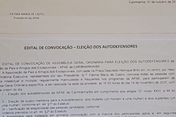 APAE de Carinhanha anuncia assembleias para eleição de diretoria e autodefensores