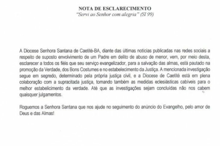 Diocese de Caetité emite nota referente ao suposto envolvimento de padre em caso de abuso sexual em Jacaraci