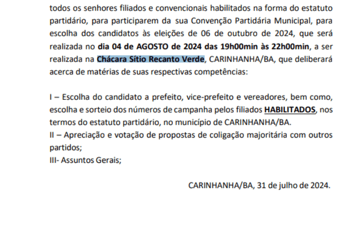 Presidente do PSD de Aracatu convoca filiados para convenção municipal no dia 4 de agosto