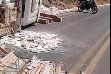 Vídeo: Caminhão carregado com pisos tomba na BR-030, na Serra dos Brindes