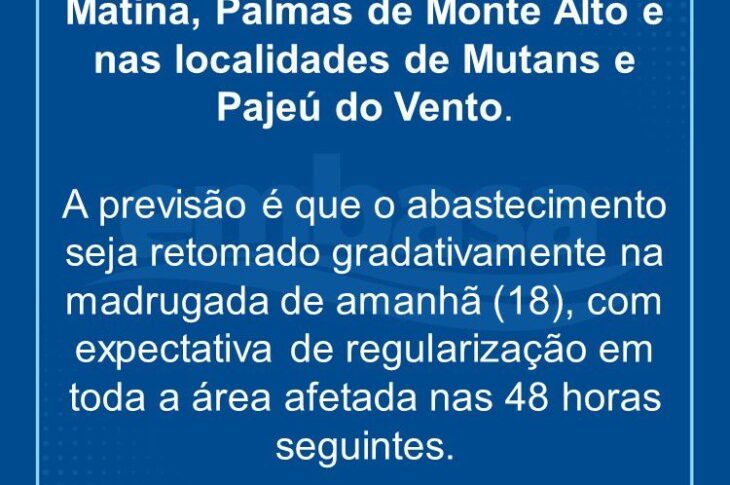 Embasa interrompe o fornecimento de água em Malhada,Iuiu,Palmas de Monte Alto, Guanambi e Candiba