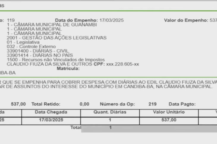 “Farra” de diárias na Câmara de Guanambi paga mais de R$ 500 para vereador cumprir agenda em Candiba