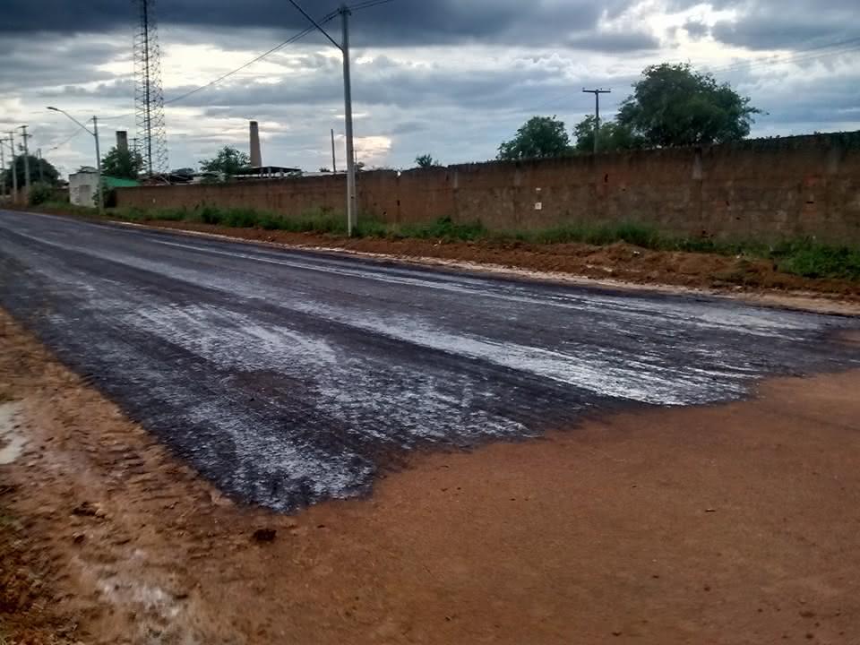 Nas imagens, aplicação do piche. Na sequência segundo o responsável pela obra, o engenheiro Fábio, será colocado a pedra brita e o concreto asfáltico usinado.