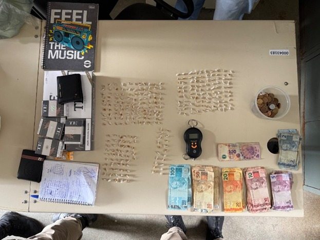 Durante a abordagem, os policiais localizaram, dentro da sacola, uma porção de substância análoga ao crack. Em continuidade às diligências, foram encontradas outras porções da mesma substância em diferentes pontos indicados pelos envolvidos, além de uma balança de precisão, cadernos com anotações relacionadas ao tráfico e dinheiro em espécie.