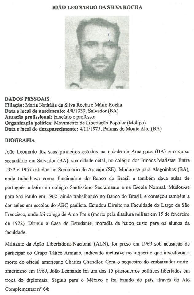 A Comissão Nacional da Verdade divulgou no último dia 10 de dezembro, seu relatório final sobre os desaparecidos políticos do período mais macabro do País. Entre desaparecidos, a Comissão Nacional da Verdade está realizando pesquisas de campo com o objetivo de encontrar o local de sepultamento do professor e estudante de direito João Leonardo da Silva Rocha, militante da Molipo, morto na cidade de Palmas de Monte Alto, sudoeste da Bahia, em suposto confronto com policiais militares em junho de 1975.