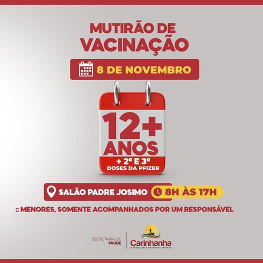 CARINHANHA – Adolescentes com idade a partir de 12 anos já podem se vacinar em Carinhanha, na próxima segunda-feira (8). O mutirão acontece das 08h às 17, no Salão padre Josimo.