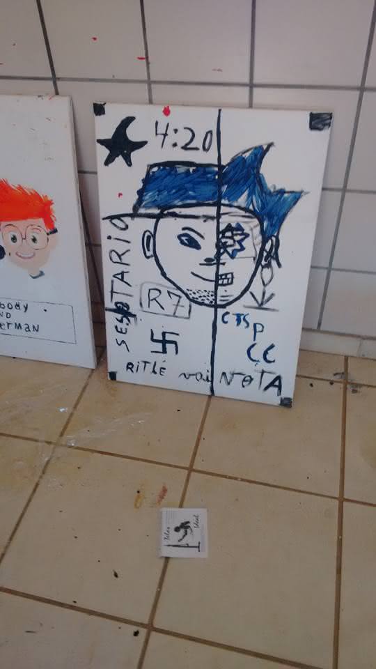 Em uns dos quadros, os vândalos deixaram o símbolo do nazismo desenhado. As autorias dos ataques ainda são desconhecidas, mas a polícia deve apurar o caso.