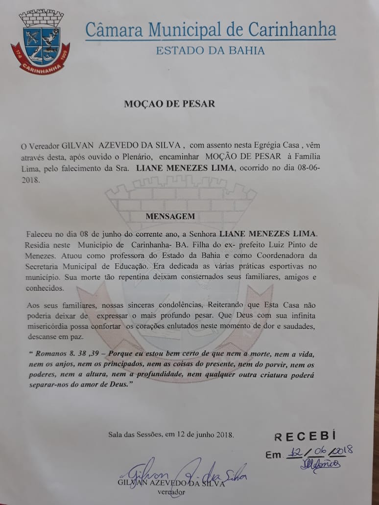 O vereador Gilvan Azevedo da Silva (Gilvan Crente) apresentou na noite da última segunda-feira, 18 de junho, na Sessão Ordinária, a MOÇÃO DE PESAR aos familiares da professora Liane Menezes Lima, ocorrido no dia 8 de junho.
