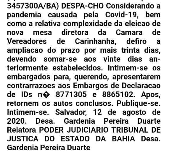 De acordo com Evânia, ela não reconhece essa extraordinária convocada pelos colegas. A presidente esclareceu que os colegas desrespeitaram uma decisão da desembargadora, Gardênia Pereira Duarte, prorrogou o prazo por mais 30 dias devido à pandemia do novo coronavírus. “Decisão judicial é para ser cumprida, então não tenho conhecimento de eleição para segunda-feira”, disse Evânia.