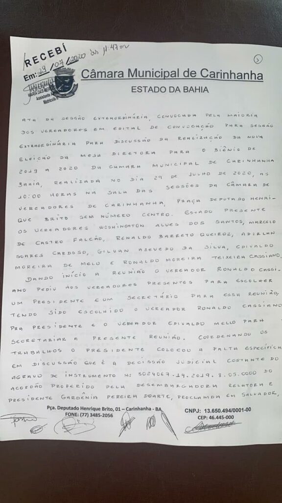 CARINHANHA – Em extraordinária realizada no dia 29 de julho, o presidente, vereador Ronaldo Moreira Cassiano, este escolhido por 7 dos 11 vereadores, convocaram para dia 24 de agosto, uma nova eleição para escolher o novo presidente da Câmara de Vereadores de Carinhanha.